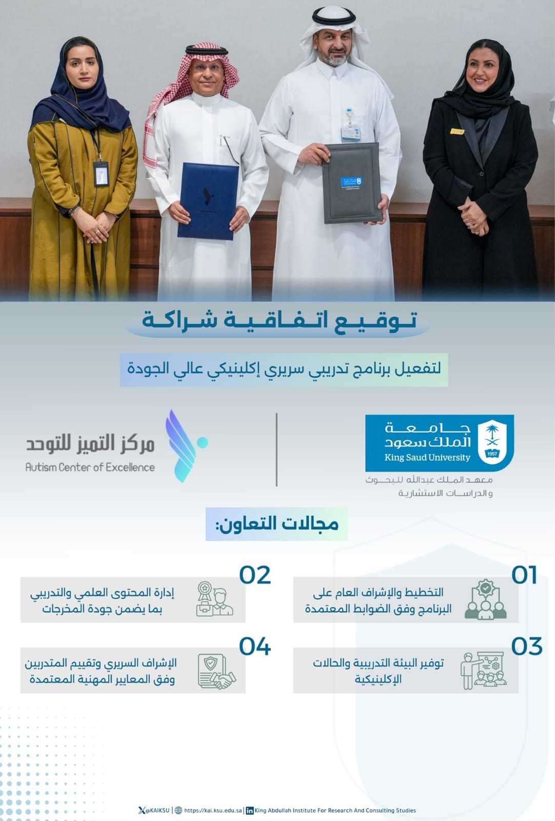 في إطار تعزيز التعاون المؤسسي وبناء شراكات استراتيجية ذات أثر مستدام، تم توقيع اتفاقية شراكة بين مركز التميز للتوحد وجامعة الملك سعود وتهدف هذه الاتفاقية إلى تطوير وتنفيذ برامج تدريبية متخصصة عالية الجودة، تسهم في رفع كفاءة الممارسين والكوادر العاملة، والارتقاء بمستوى الخدمات المقدمة للأشخاص ذوي اضطراب طيف التوحد، وذلك وفق أفضل المعايير المهنية والأكاديمية المعتمدة، من خلال كلية العلوم الطبية التطبيقية. | ![]()